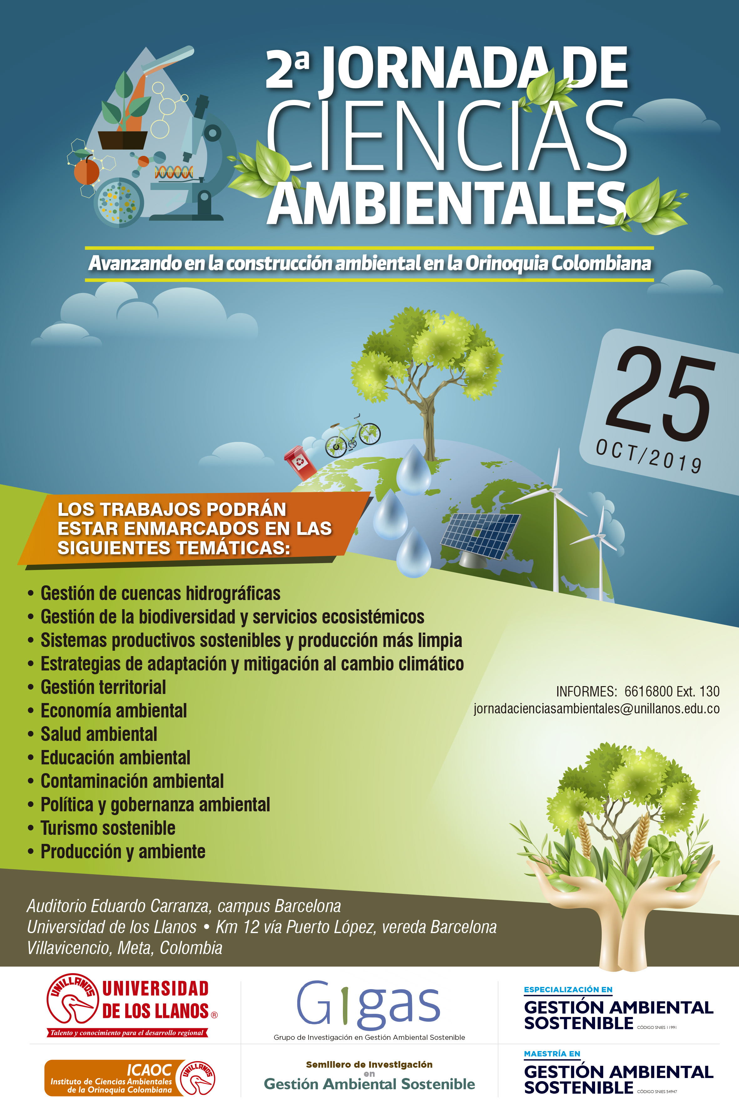 Desde el ICAOC y los posgrados en Gestión Ambiental Sostenible de Unillanos se invitan a estudiantes, profesores, representantes del sector público, privado y demás, a participar el próximo 25 de octubre de esta jornada académica que se realizará en el auditorio Eduardo Carranza de la sede Barcelona, para conocer y aportar en investigaciones realizadas referentes a lo ambiental desde la producción, salud, educación, política, gobernanza,  entre otros.