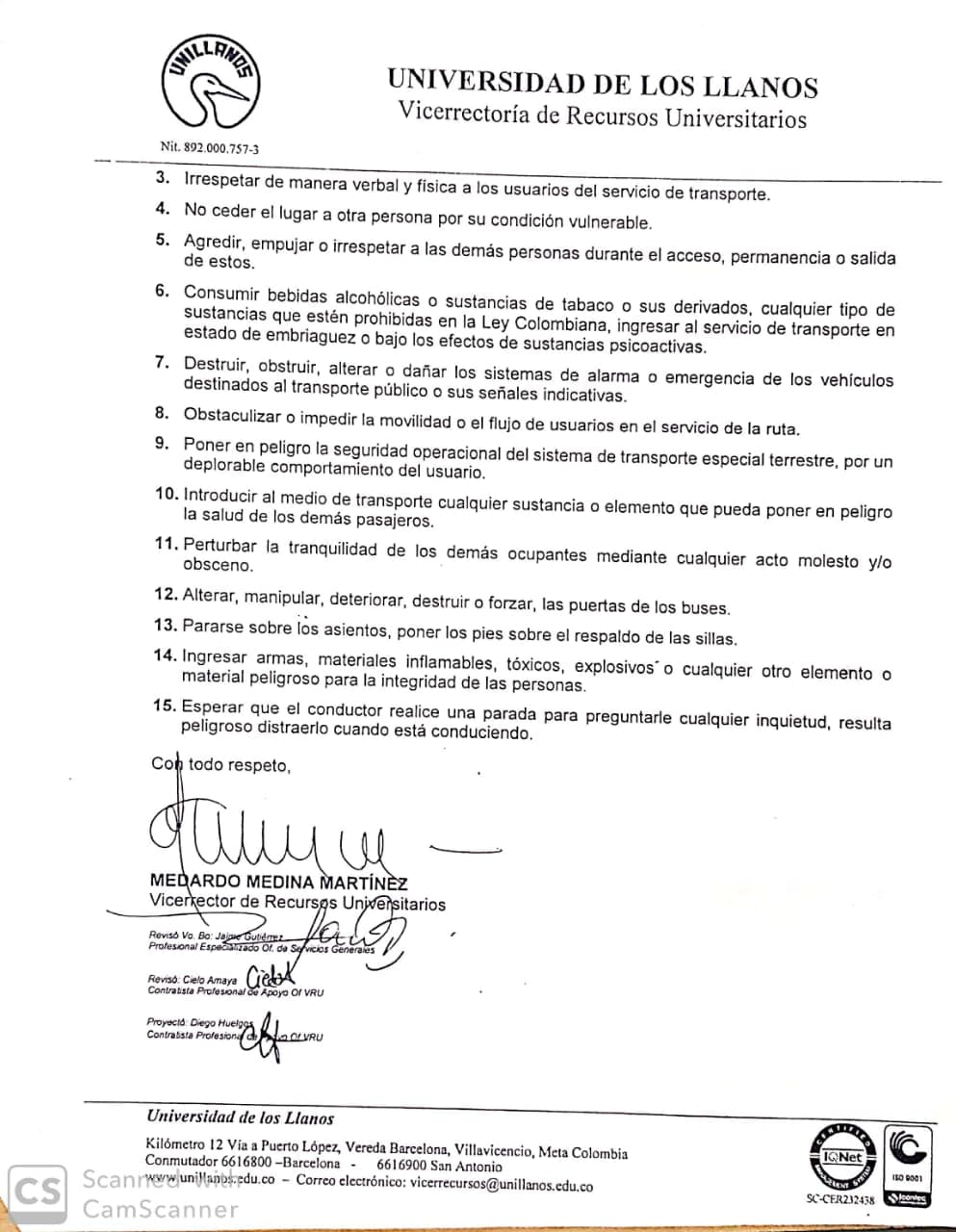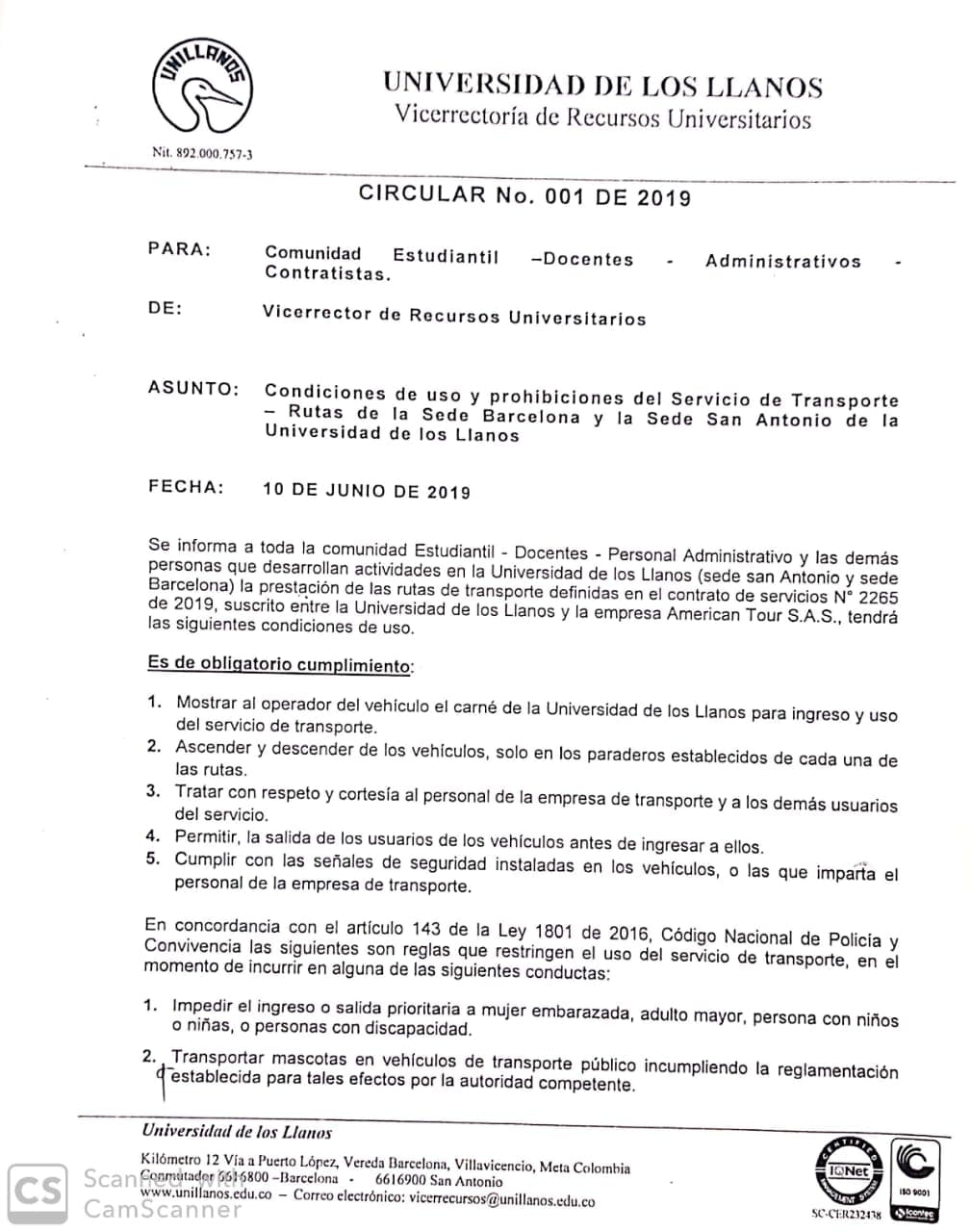 La Vicerretoría de Recursos Universitarios de la Universidad de los Llanos a través de su Circular N° 001 de 2019, informa a la comunidad estudiantil, docentes, personal administrativo y demás personas que desarrollan actividades en la Institución, las condiciones de uso y las prohibiciones del servicio de transporte – rutas de la sede Barcelona y la sede San Antonio de Unillanos.