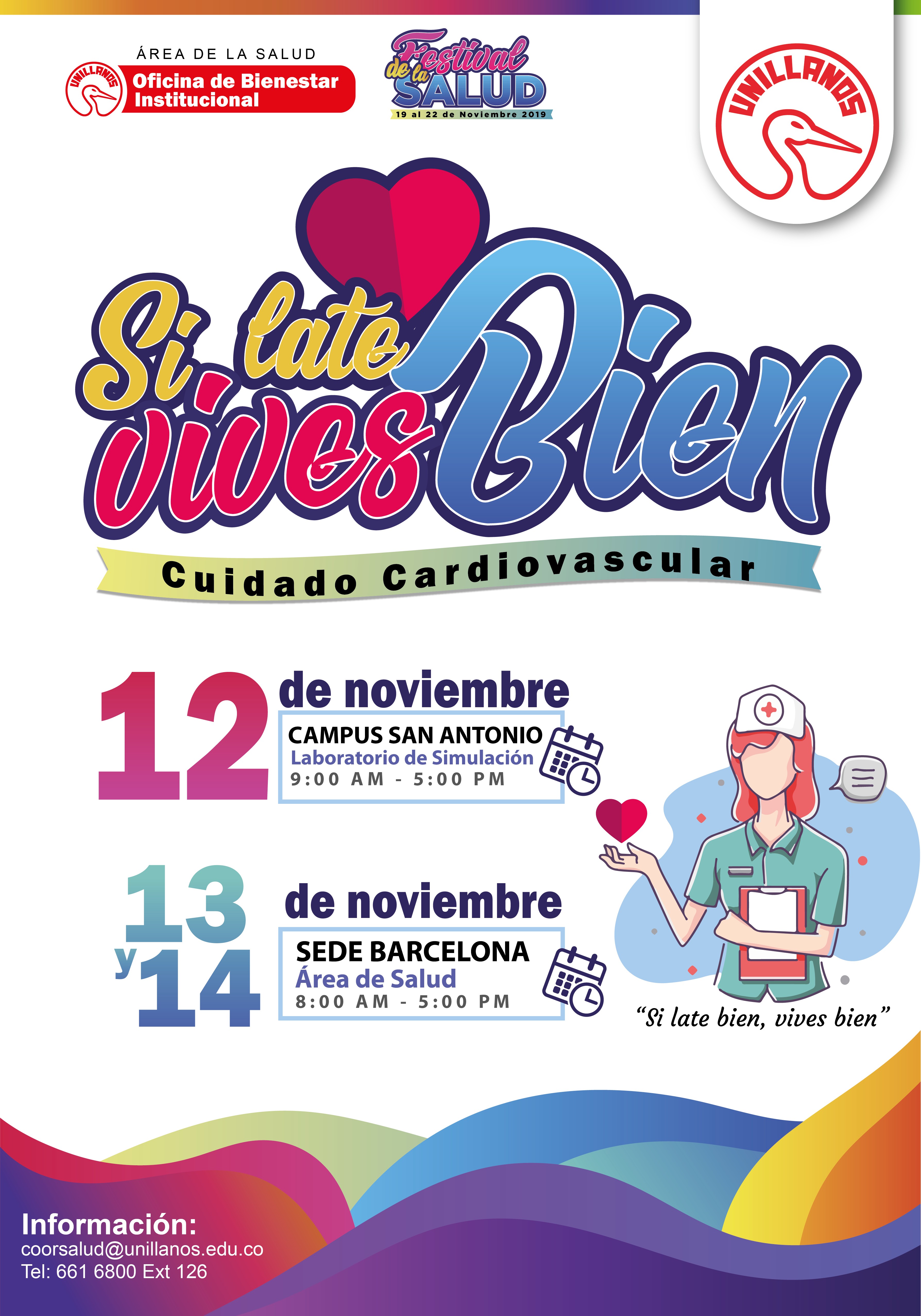 La campaña “Si late Bien, vives Bien” se va a realizar en el marco del Festival de la Salud y será los días 12 de noviembre en el campus San Antonio y los días 13 y 14 de noviembre en campus Barcelona desde las 8 de la mañana, hasta las 5 de la tarde.