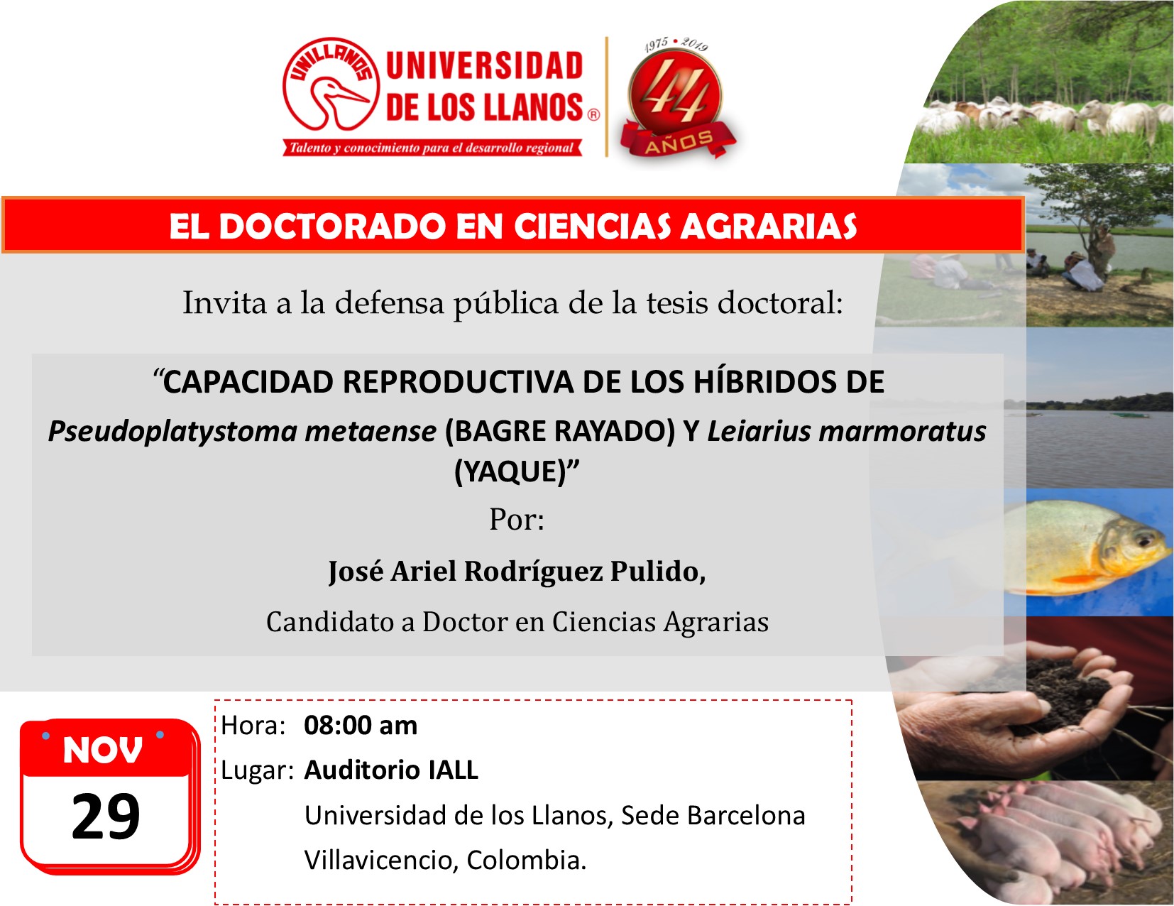 Unillanos a través del Doctorado en Ciencias Agrarias invita a la comunidad académica a presenciar la defensa pública de la tesis doctoral “Capacidad Reproductiva de los Híbridos de Bagre Rayado y Yaque” presentado por el investigador José Ariel Rodríguez Pulido.