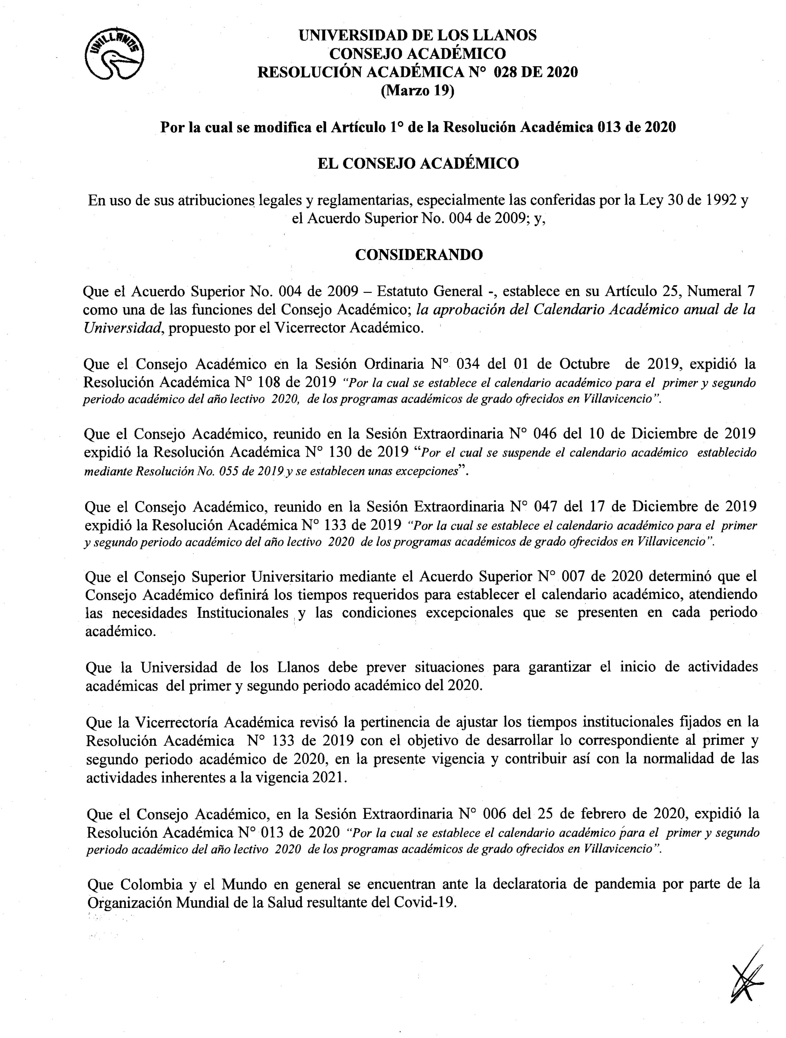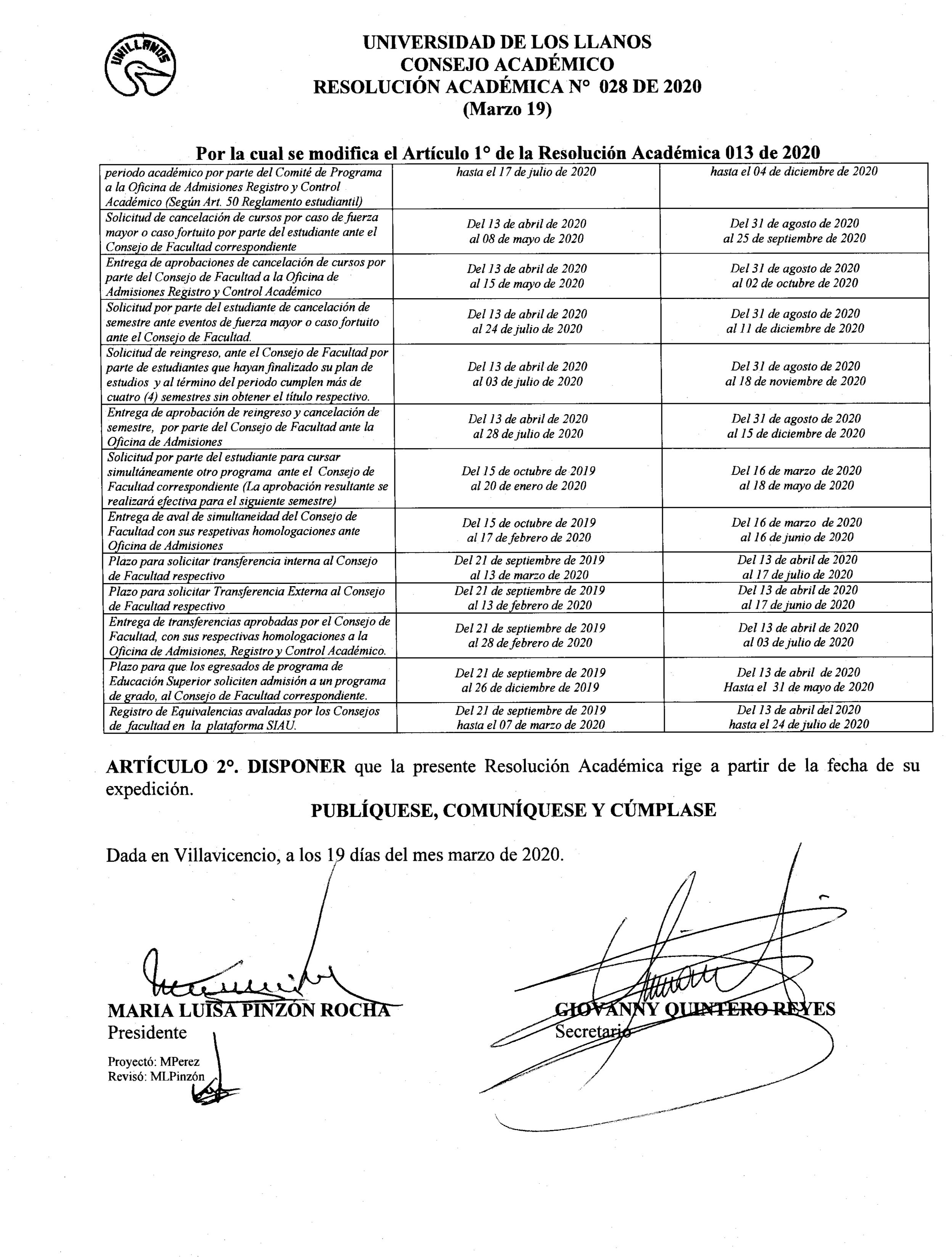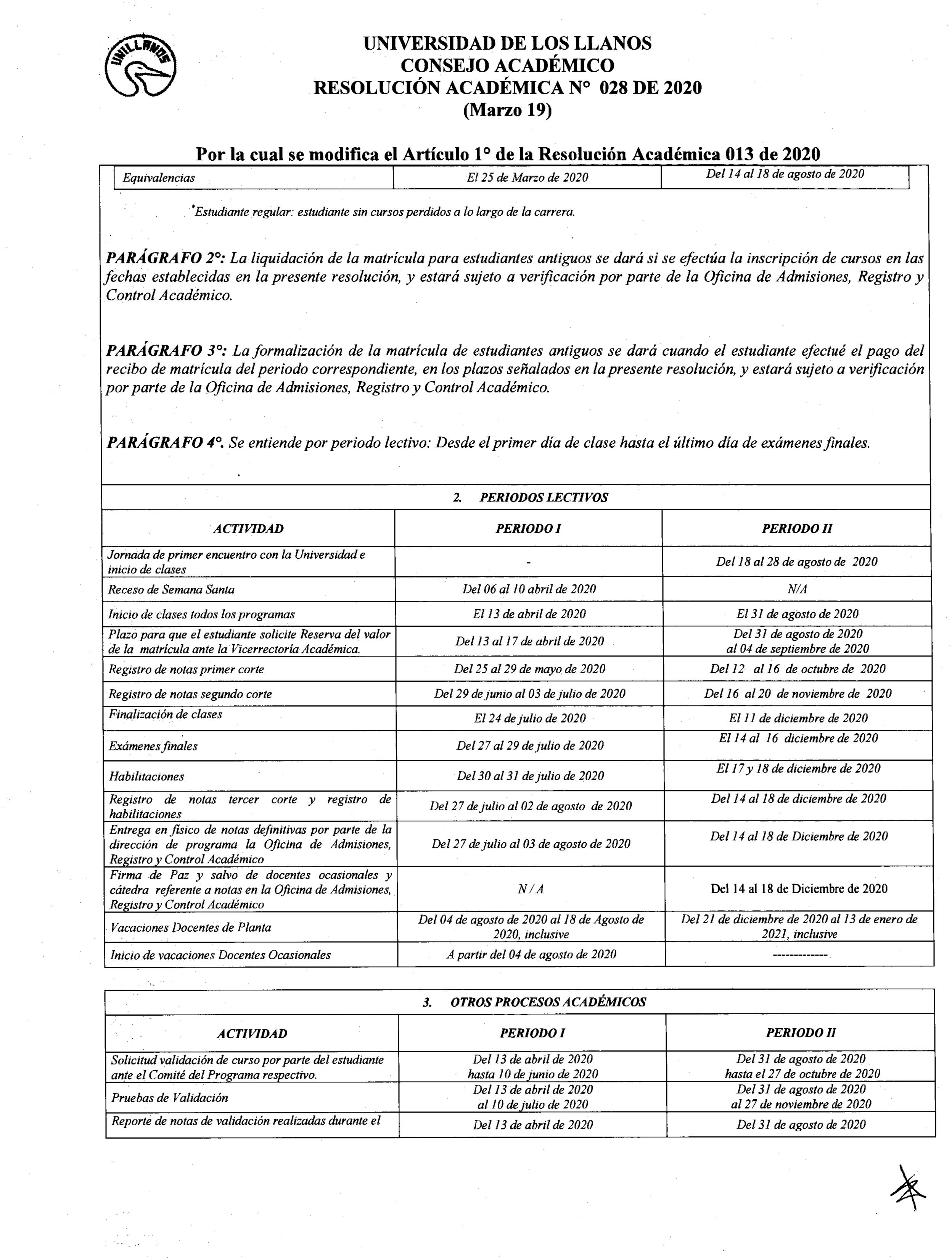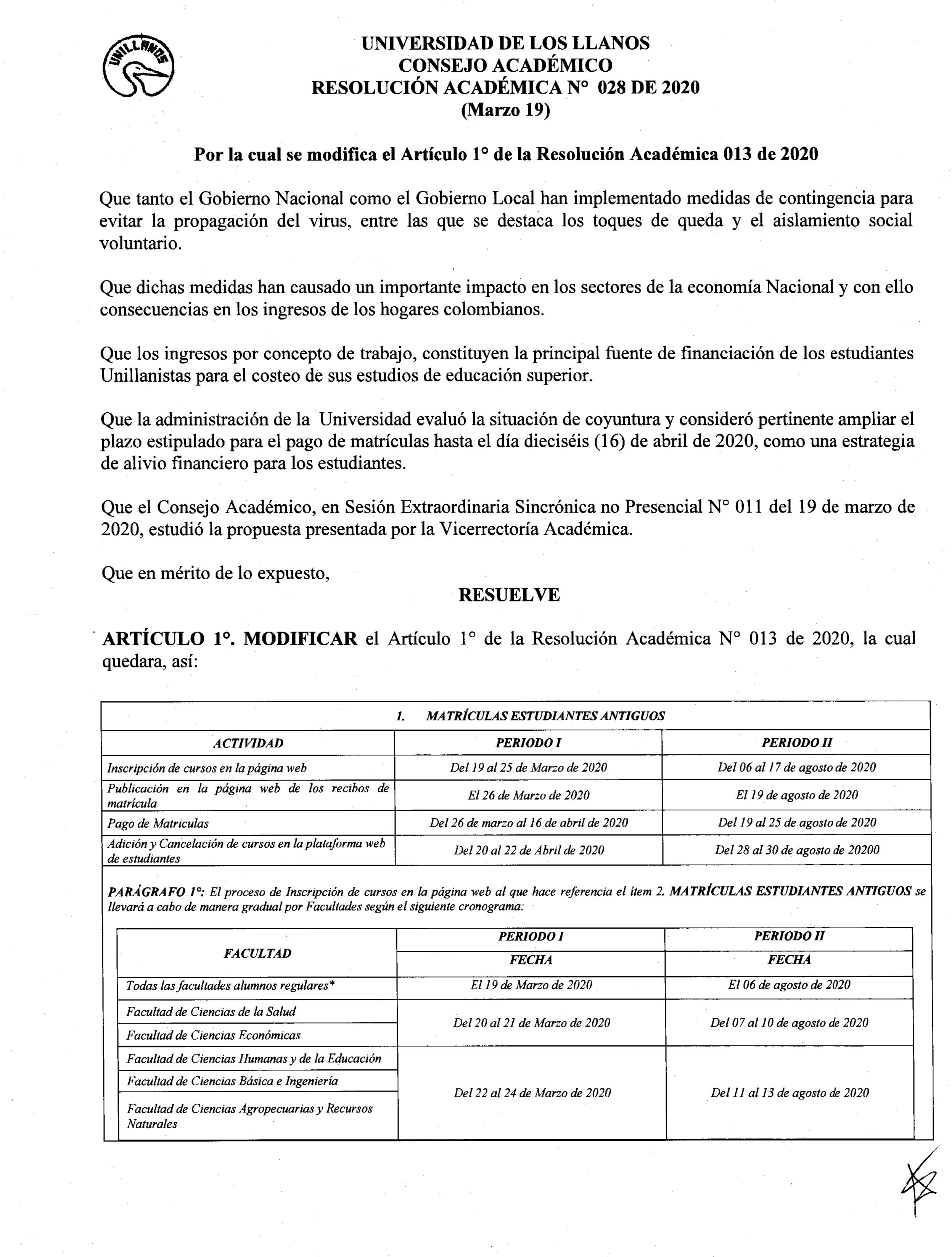 Consejo Académico de la Universidad de los Llanos, estableció mediante Resolución N° 028 de 2020, la ampliación para el pago de matrícula hasta el 16 de abril para el periodo primer periodo académico 2020 evaluando la situación actual.