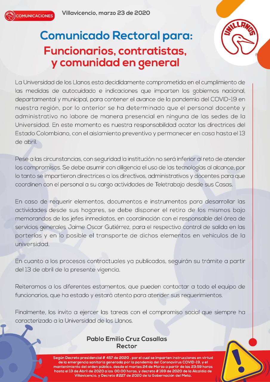 Comunicado Rectoral para: Funcionarios, contratistas y comunidad en general