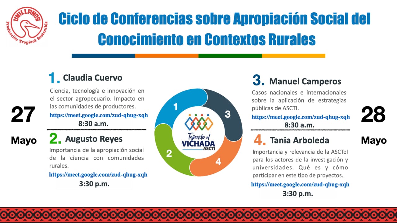 Estas actividades son realizadas con apoyo de la Universidad de los Llanos y estarán a cargo de personas con amplia experiencia y trayectoria en temas relacionados con Apropiación Social del Conocimiento - ASC. Conozca los enlaces para acceder a las conferencias:
