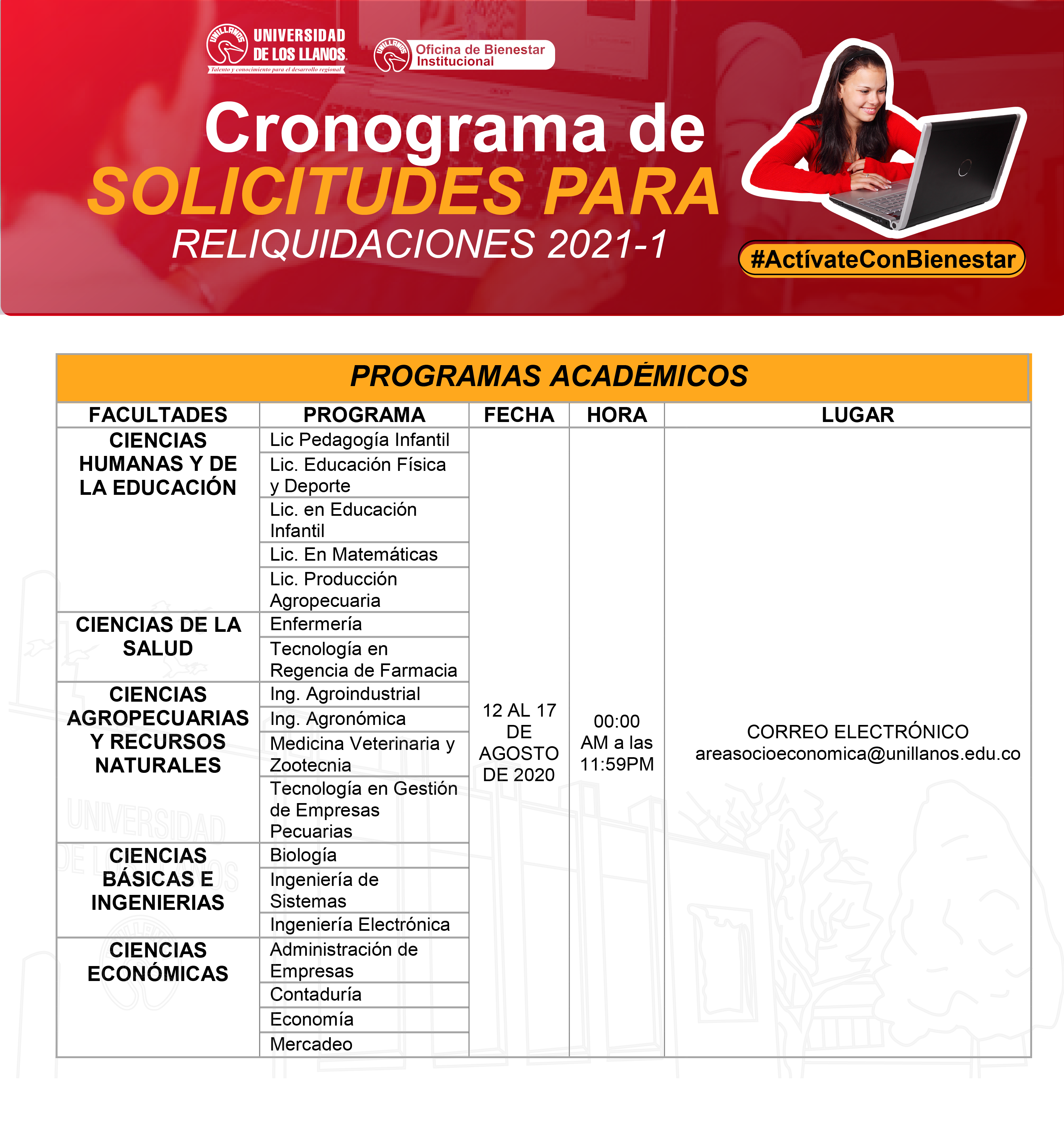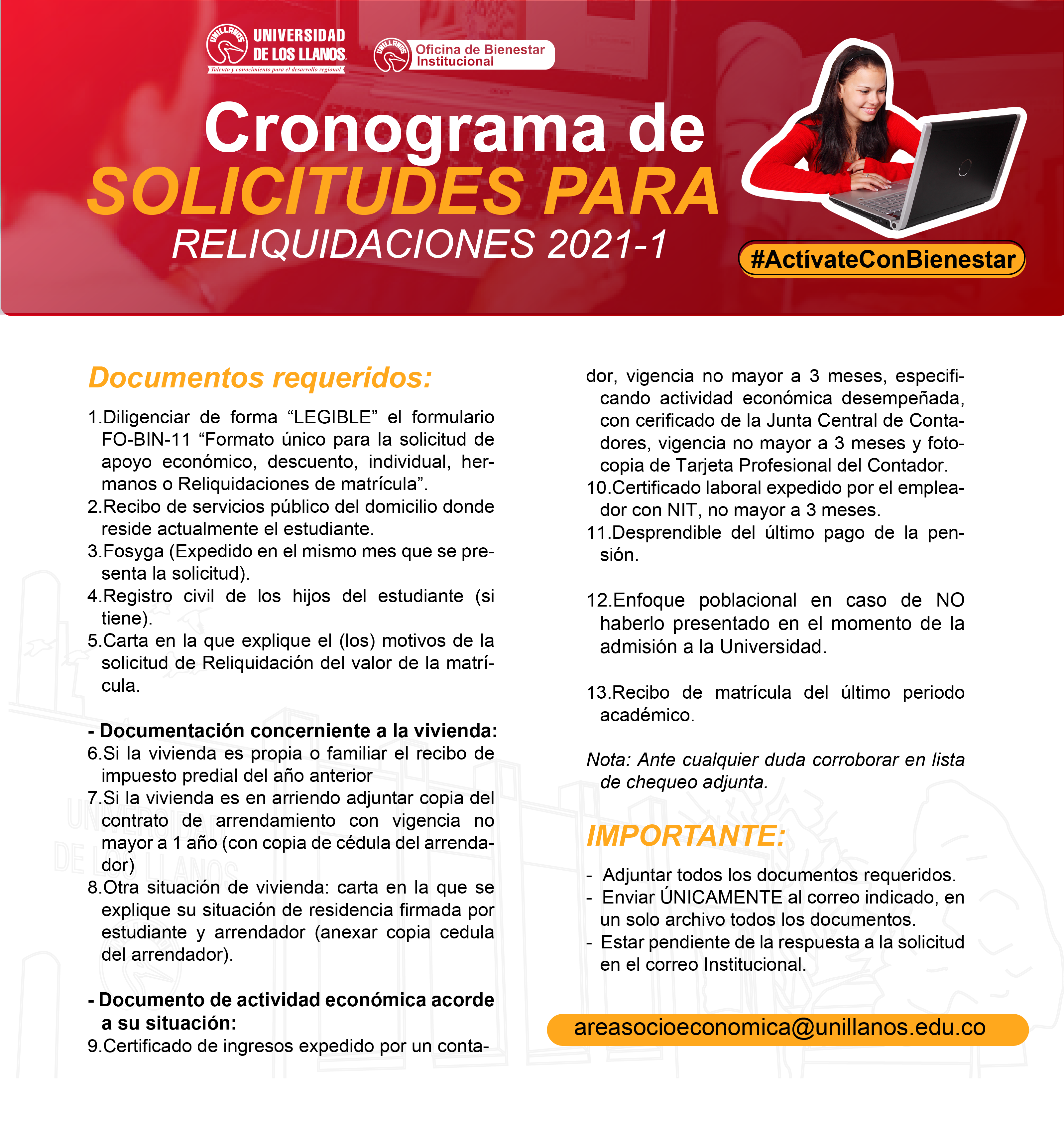 La Oficina de Bienestar Institucional informa a la comunidad universitaria el cronograma para radicar sus solicitudes para reliquidaciones de matrícula 2021-1.