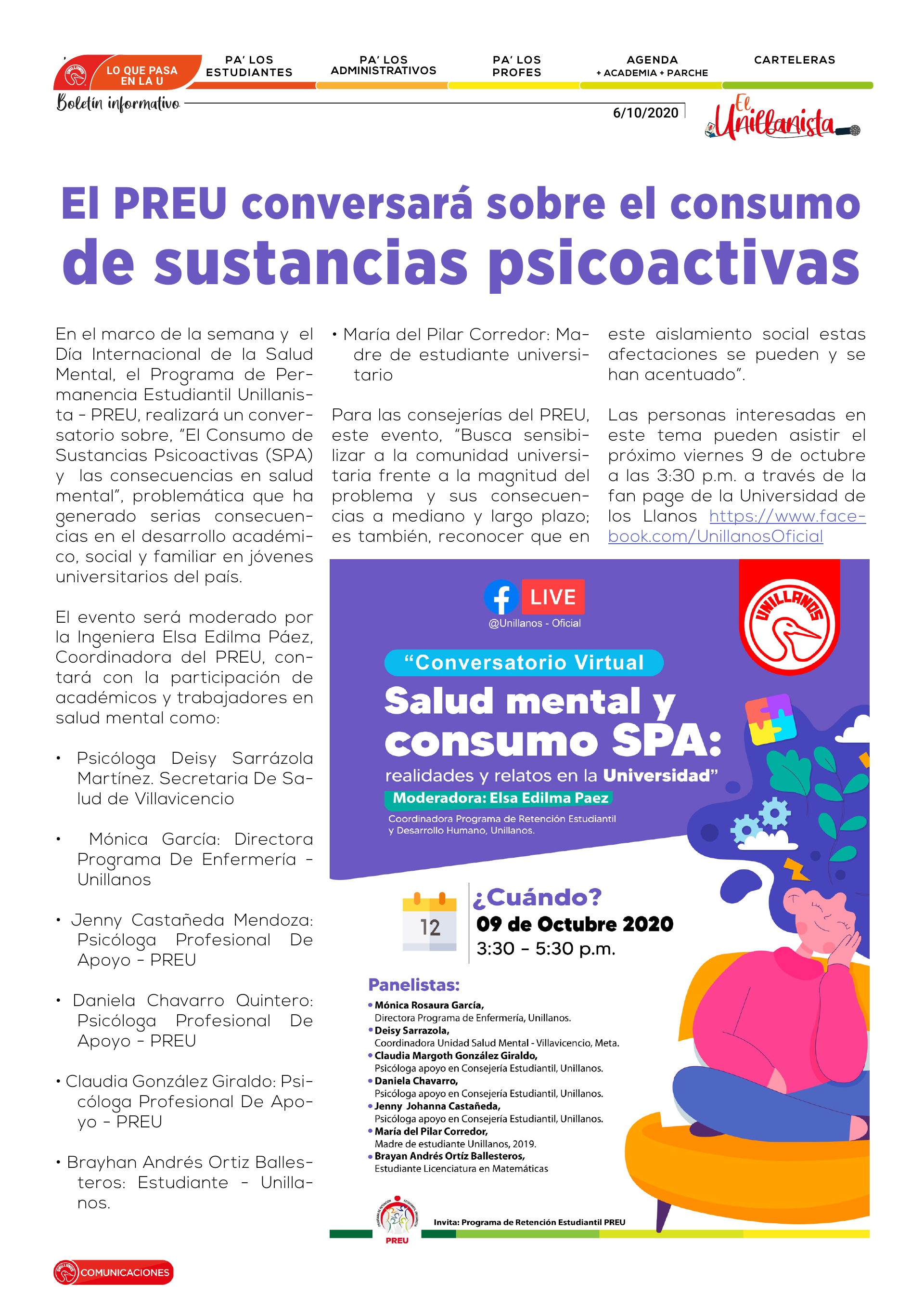 Las personas interesadas en este tema pueden asistir el próximo viernes 9 de octubre a las 3:30 p.m. a través de la fan page de la Universidad de los Llanos https://www.facebook.com/UnillanosOficial