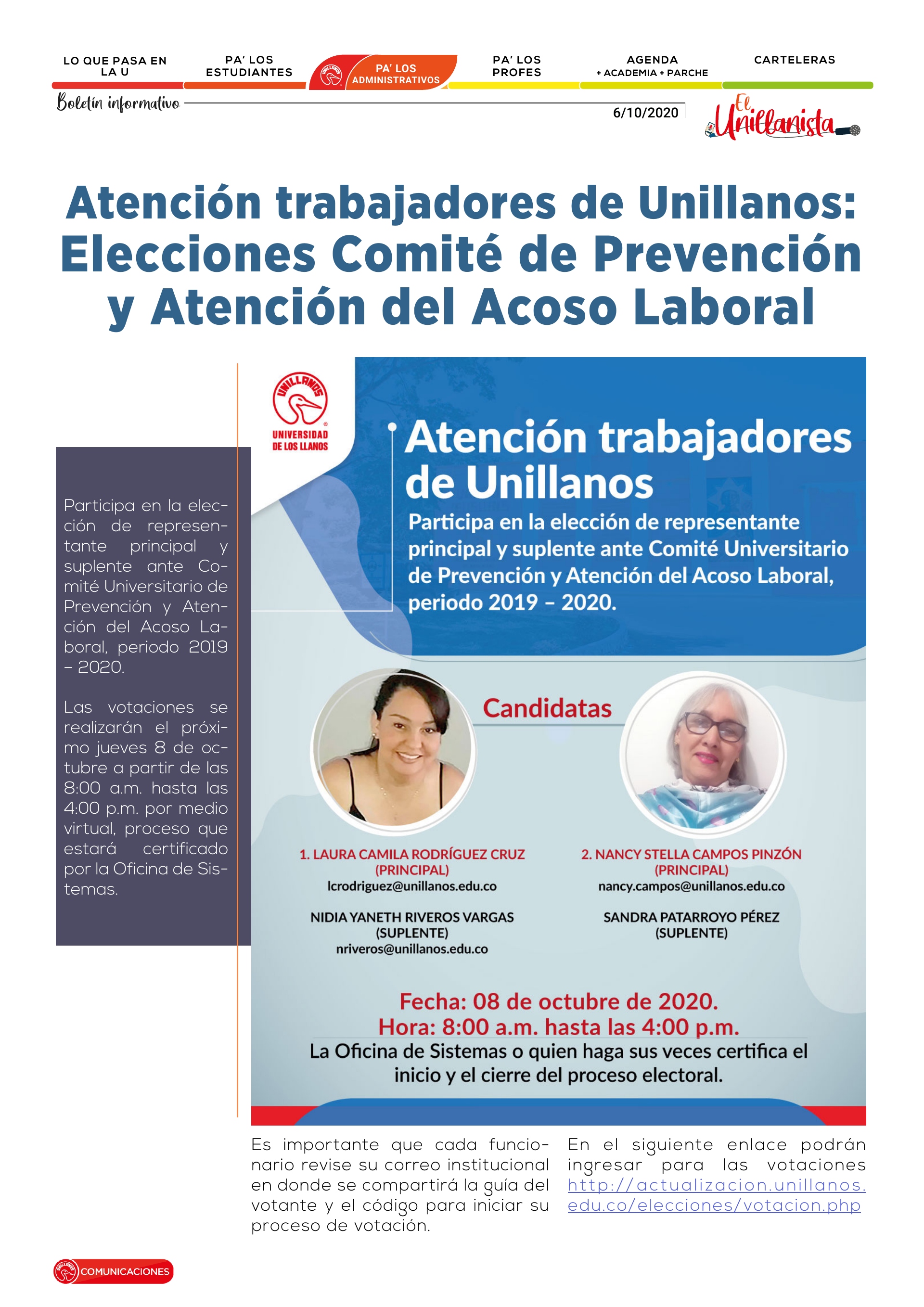 Es importante que cada funcionario revise su correo institucional en donde se compartirá la guía del votante y el código para iniciar su proceso de votación. En el siguiente enlace podrán ingresar para las votaciones http://actualizacion.unillanos.edu.co/elecciones/votacion.php
