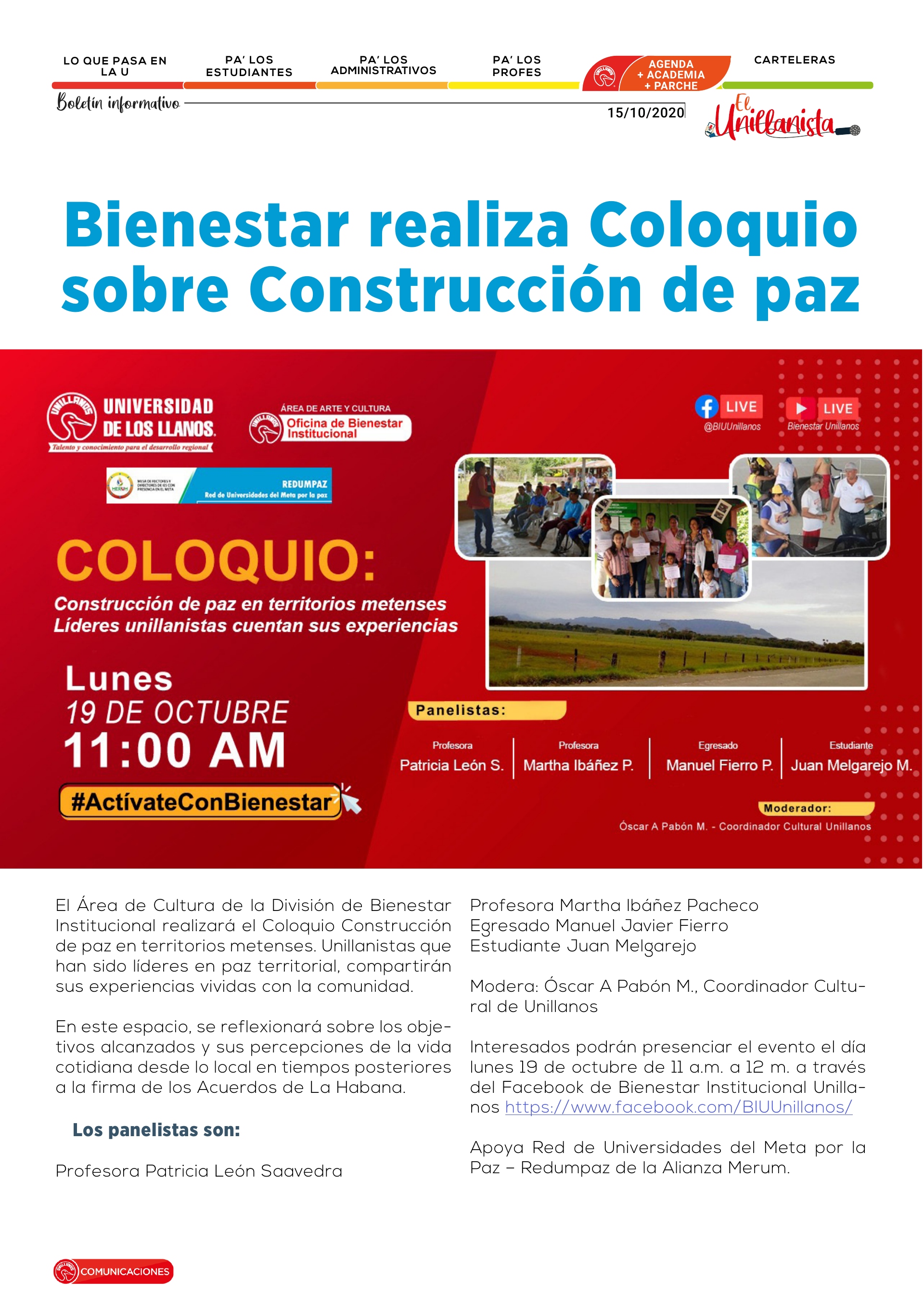 Interesados podrán presenciar el evento el día lunes 19 de octubre de 11 a.m. a 12 m. a través del Facebook de Bienestar Institucional Unillanos https://www.facebook.com/BIUUnillanos/