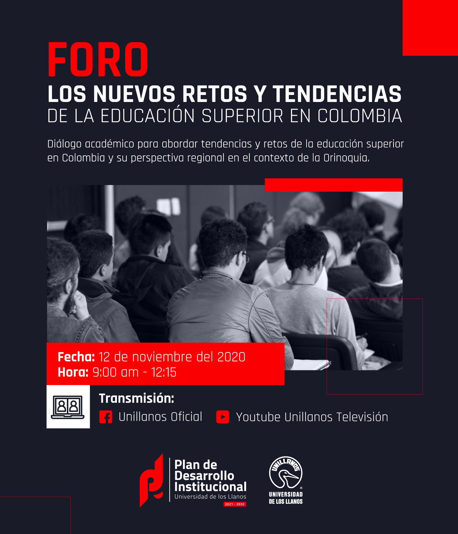 En el marco de la construcción del Plan de Desarrollo Institucional 2021-2032 de la Universidad de los Llanos, se realizará una serie de foros denominados, “Retos y Tendencias de la Educación Superior”, con el ánimo de escuchar las voces de actores internos y externos de la Institución, que contribuyan a la construcción de un instrumento de planificación estratégica, respondiendo a las nuevas necesidades del contexto y a la altura de los nuevos retos en los próximos 12 años.