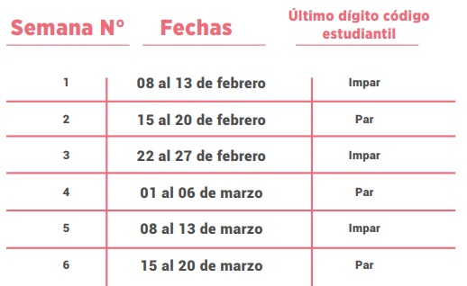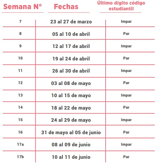 Asistencia de estudiantes: Las actividades docentes presenciales en el campus universitario se desarrollarán de manera alternada; la asistencia de los estudiantes se hará por semanas y según el último dígito del código que refiera el carné estudiantil, de acuerdo con el siguiente cronograma: