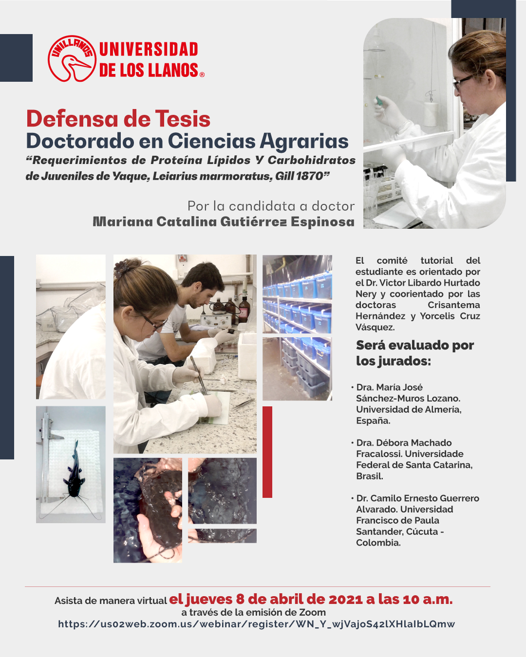 El Doctorado en Ciencias Agrarias de la Universidad de los Llanos invita a toda la comunidad universitaria a presenciar la defensa pública de tesis doctoral “Requerimientos De Proteína Lípidos Y Carbohidratos De Juveniles De Yaque, Leiarius Marmoratus, Gill 1870”, desarrollado por la candidata a doctor Mariana Catalina Gutiérrez Espinosa.