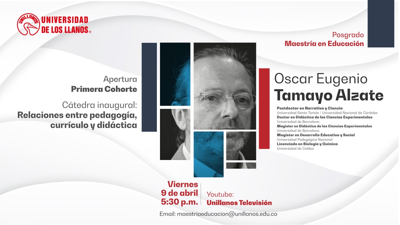 La Maestría en Educación de la Universidad de los Llanos realizará la apertura oficial de la primera cohorte de este programa de posgrado con la cátedra inaugural “Relaciones entre Pedagogía, Currículo y Didáctica” dictada por el Dr. Óscar Eugenio Tamayo Alzate, Postdoctor en Narrativa y Ciencia.