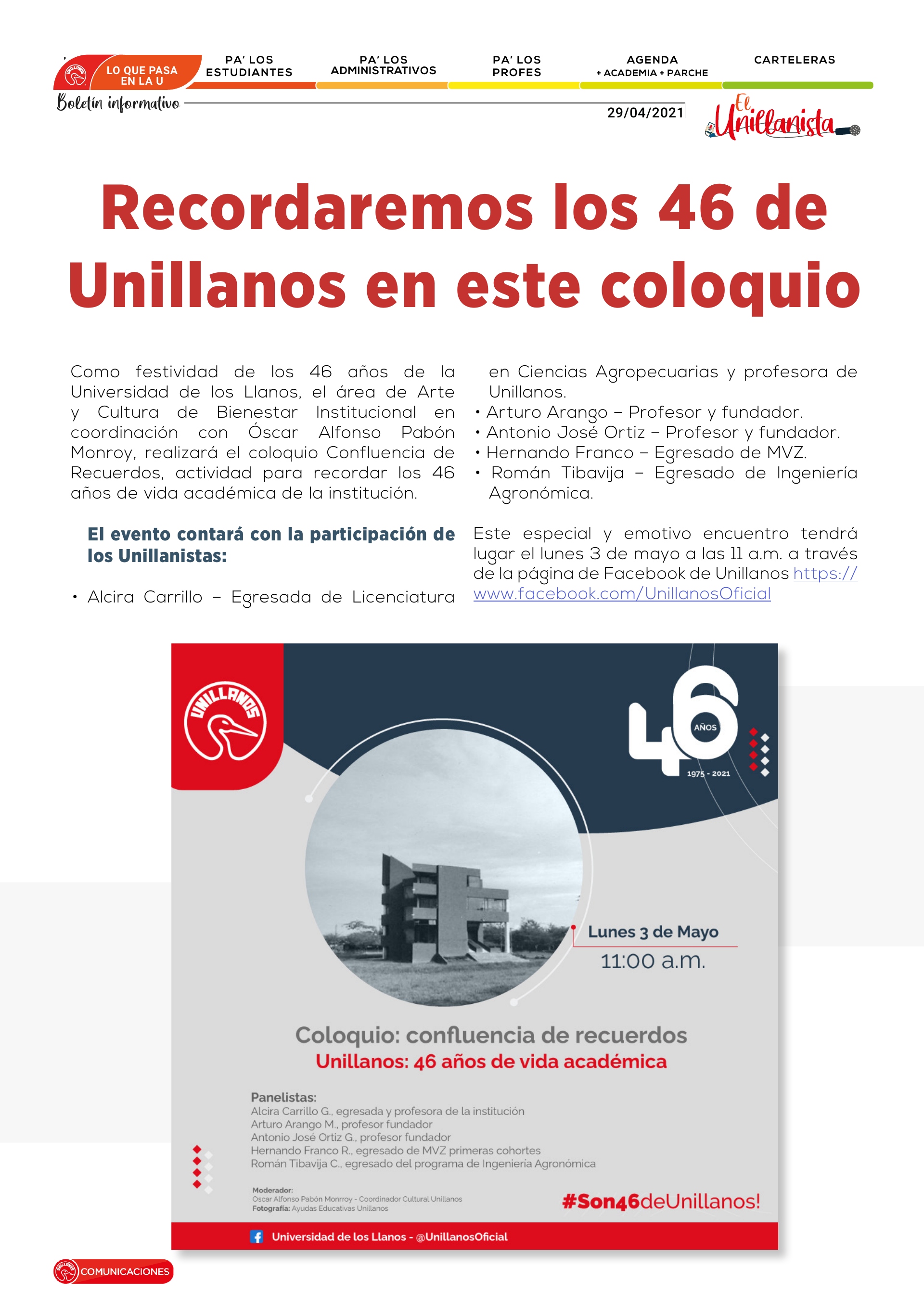 Lunes 3 de mayo a las 11 a.m. a través de la página de Facebook de Unillanos https://www.facebook.com/UnillanosOficial