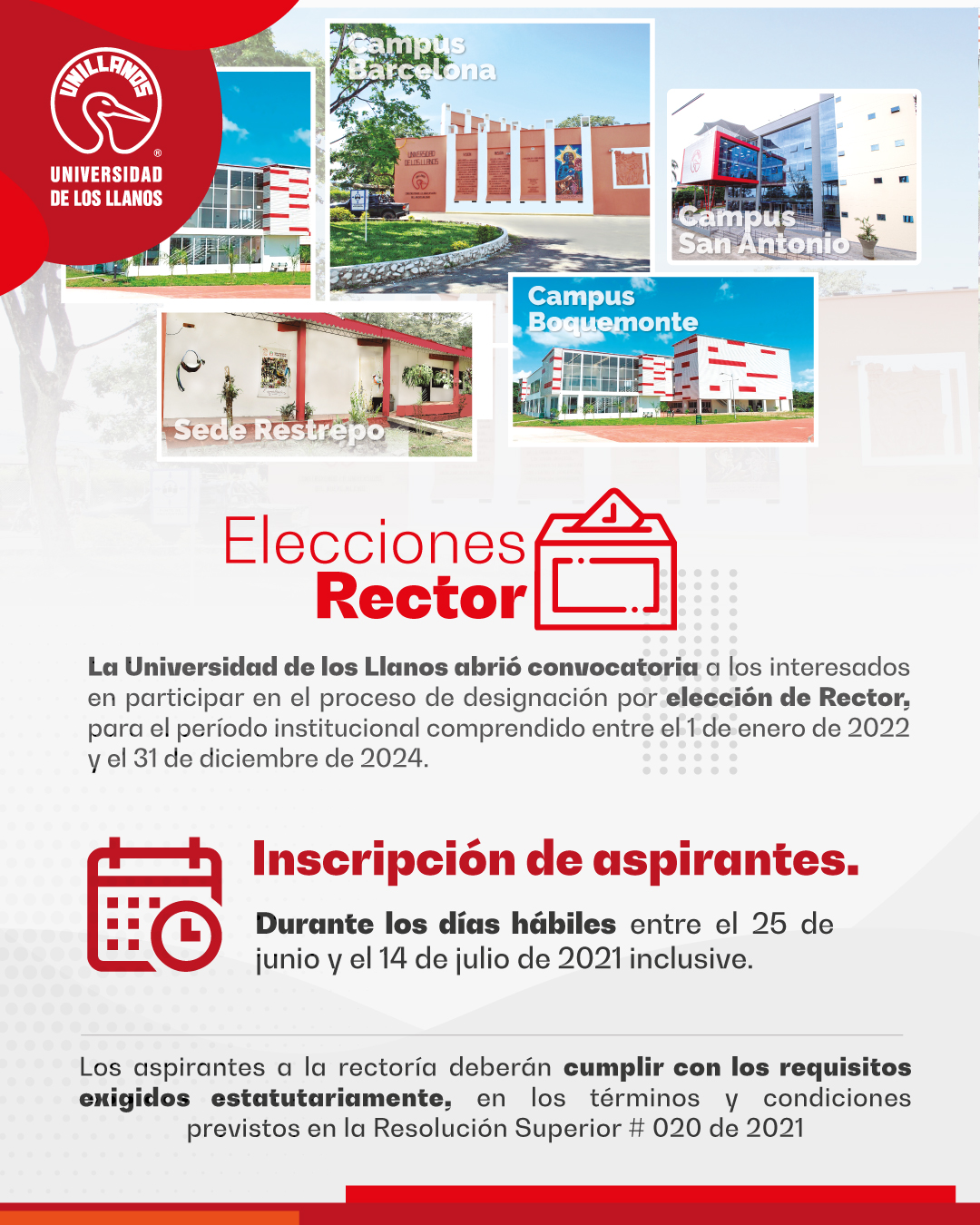Mediante Resolución Superior N° 20 del 18 de junio de 2021, la Universidad de los Llanos convoca, reglamenta y establece el procedimiento para designar por elección al Rector de la Universidad de los Llanos, para el período institucional comprendido entre el 1 de enero de 2022 y el 31 de diciembre de 2024.