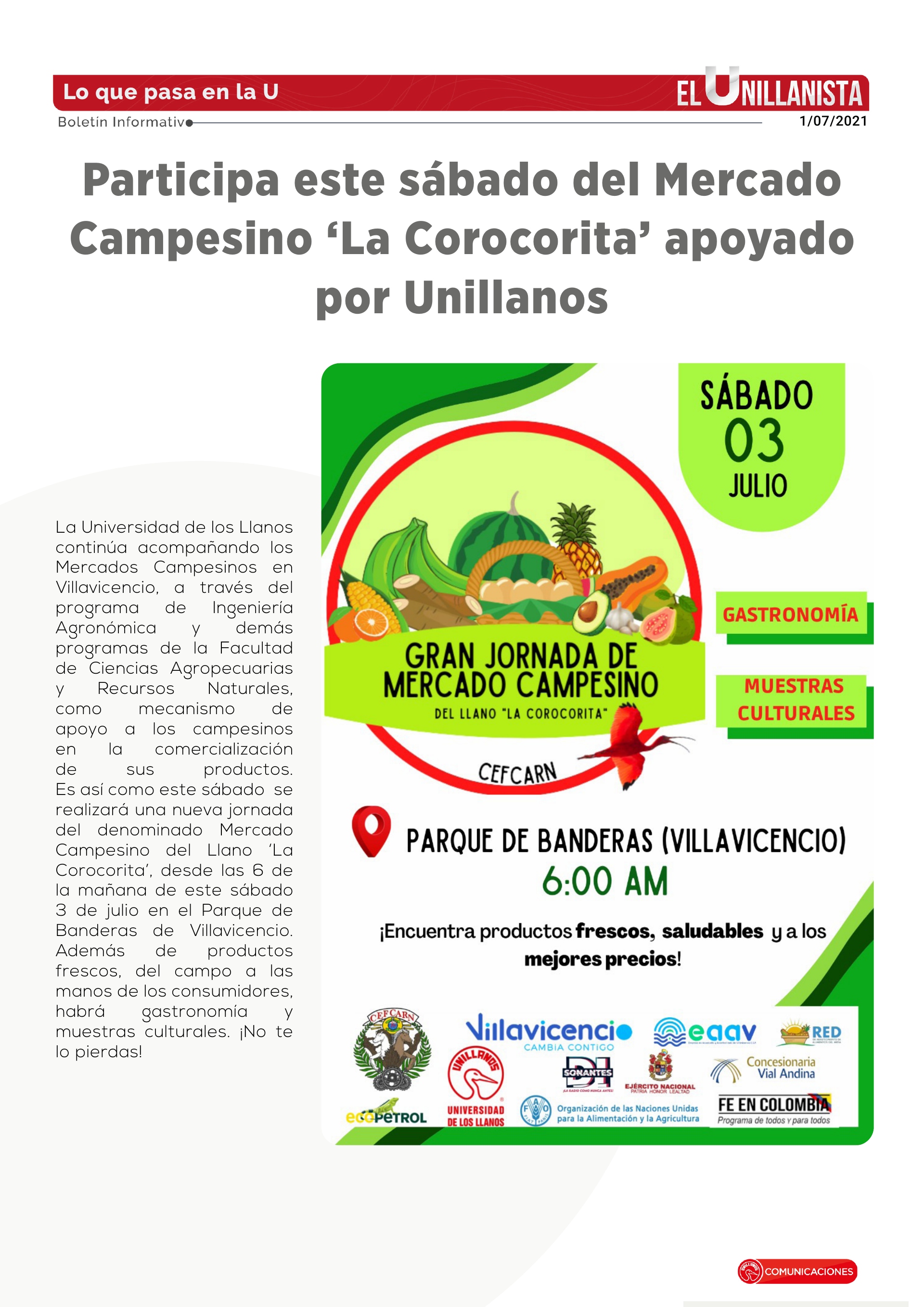 Participa este sábado del Mercado Campesino 'La Corocorita' apoyado por Unillanos