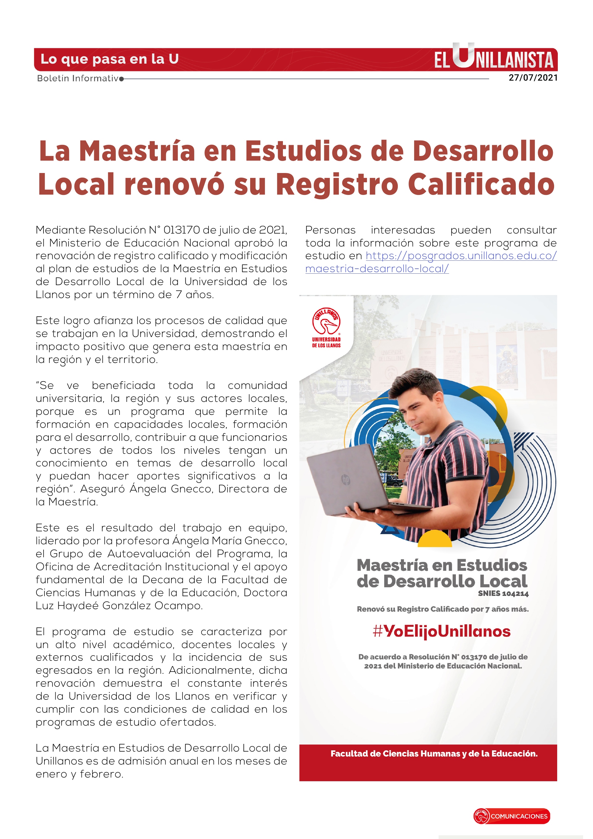 La Maestría en Estudios de Desarrollo Local renovó su Registro Calificado