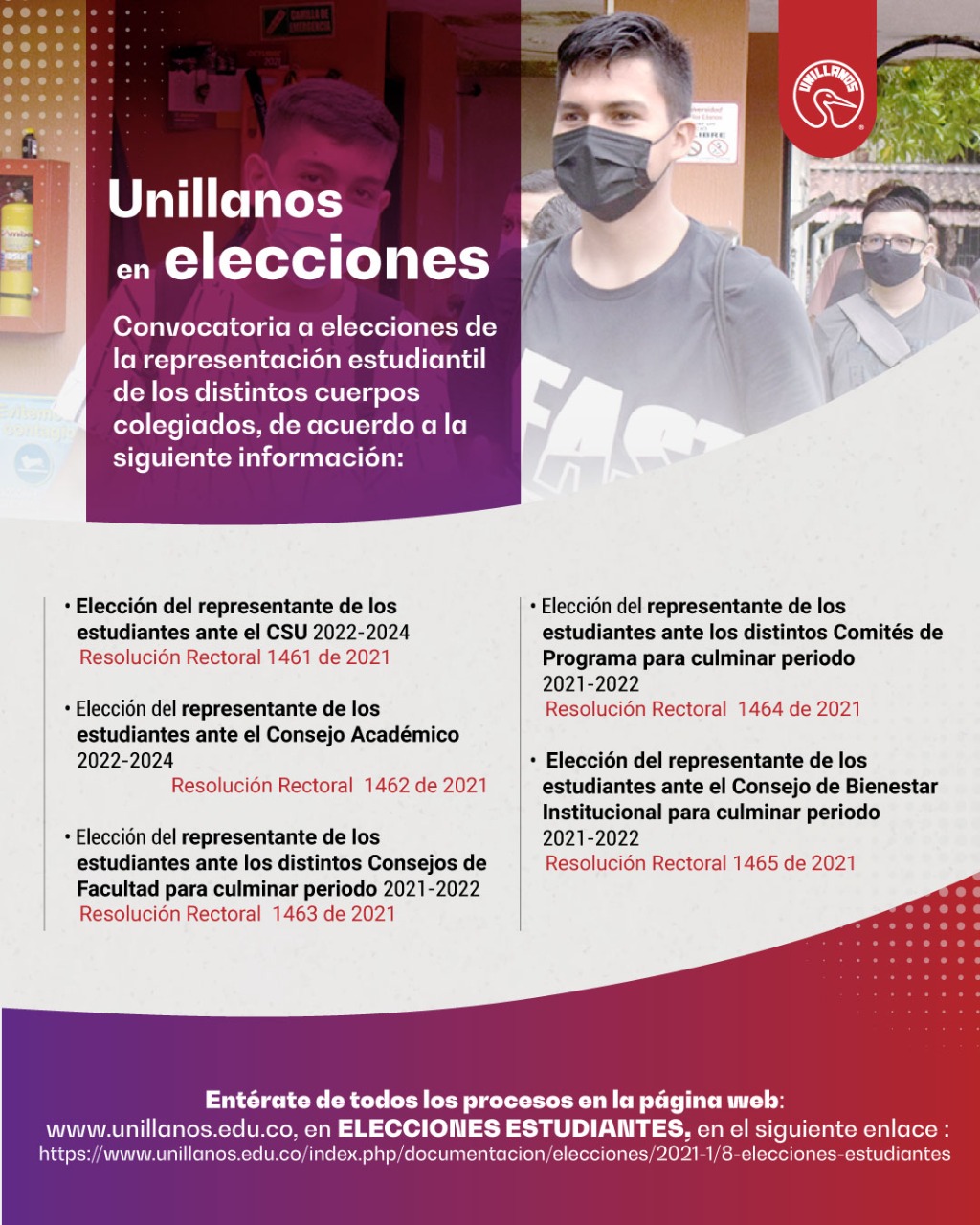 Entérate de todos los procesos en la página www.unillanos.edu.co, en la sección 'ELECCIONES ESTUDIANTES', en el siguiente enlace: https://www.unillanos.edu.co/index.php/documentacion/elecciones/2021-1/8-elecciones-estudiantes
