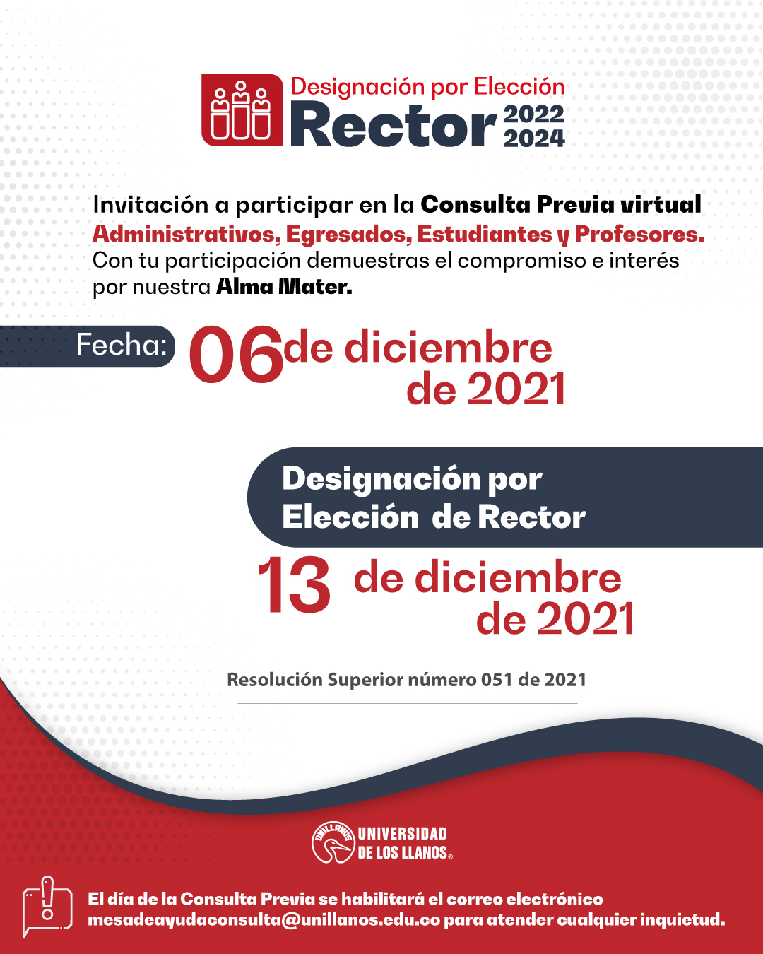 Mediante Resolución Superior N° 051 de 2021, el Consejo Superior de la Universidad de los Llanos definió las fechas para designar por elección al Rector de la Universidad de los Llanos.