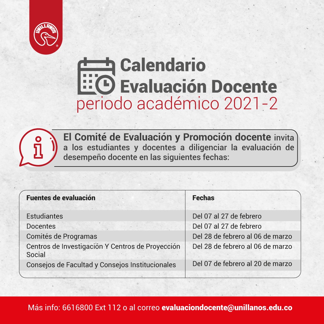 La Secretaría Técnica de Evaluación Docente y Promoción Docente de la Universidad de los Llanos, dio a conocer el Calendario de evaluación Docente año 2021-2 en la que debe participar toda la comunidad Unillanista.