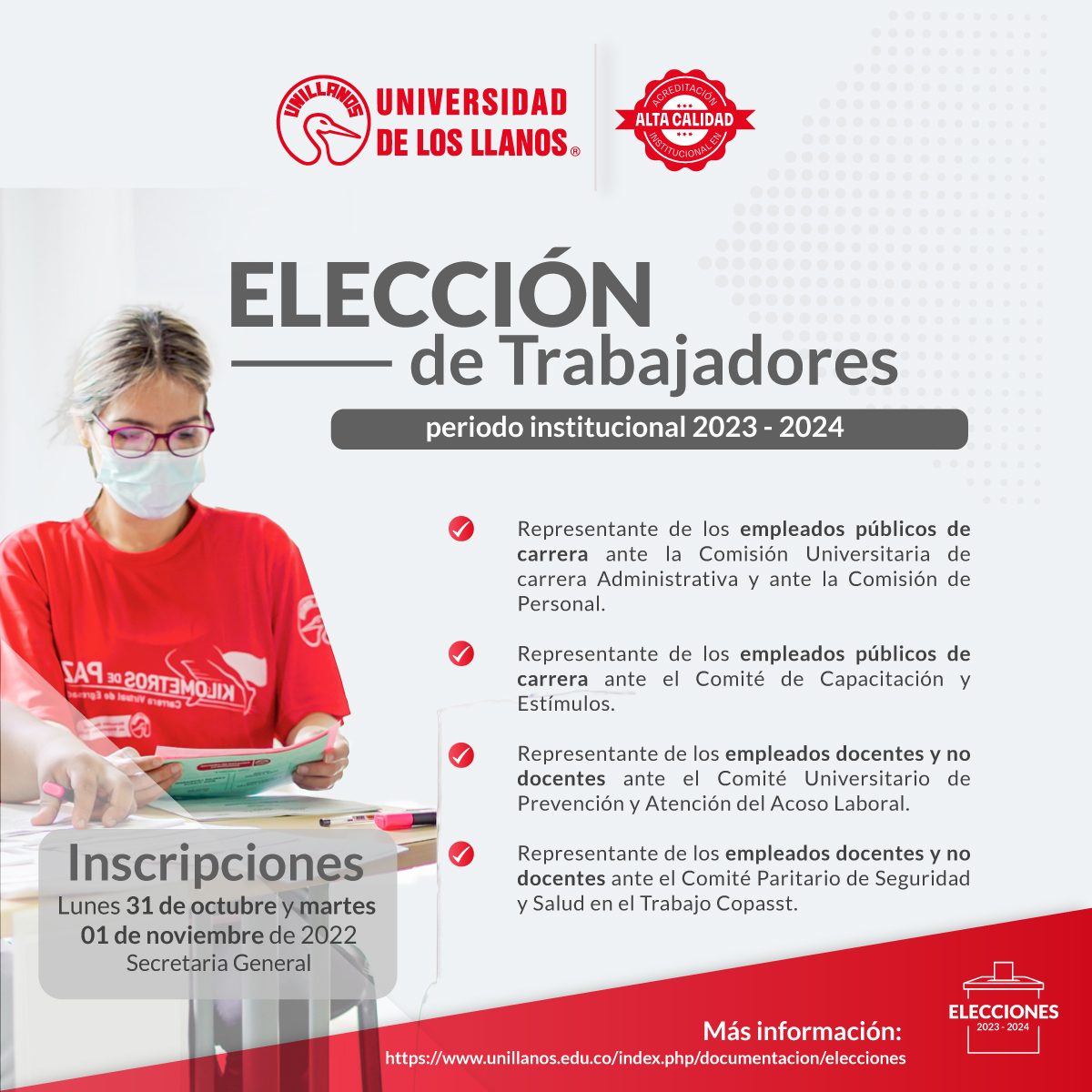 La Universidad de los Llanos informa que adelanta actualmente el proceso de elección, correspondiente a representantes de docentes y trabajadores, periodo institucional 2023 – 2024, por lo cual invita a los estamentos en mención a participar activamente a través de los siguientes enlaces: