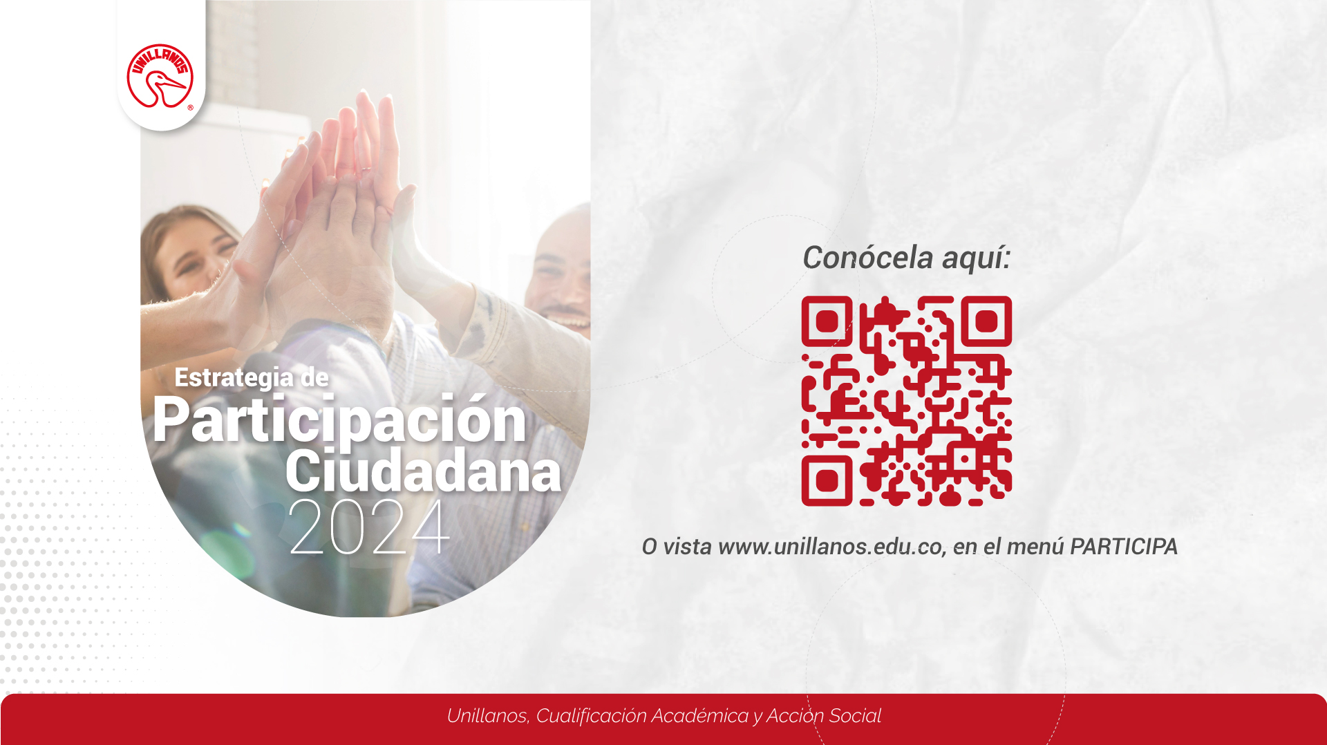 La Universidad de los Llanos informa a la ciudadanía en general, que ya está disponible la Estrategia de Participación Ciudadana 2024 de esta Institución, por lo cual invita a las personas interesadas en conocerla, a ingresar al siguiente link: https://www.unillanos.edu.co/index.php/participa o escaneando el código QR de la imagen. Unillanos, Cualificación Académica y Acción Social.