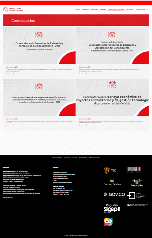 Desde el menú 'Proyectos' en la sección 'Convocatoria de Proyectos' de nuestro micrositio de Proyección Social, disponible en https://proyeccionsocial.unillanos.edu.co/?page_id=81, puedes acceder a todas las convocatorias gestionadas por la Dirección General de Proyección Social.